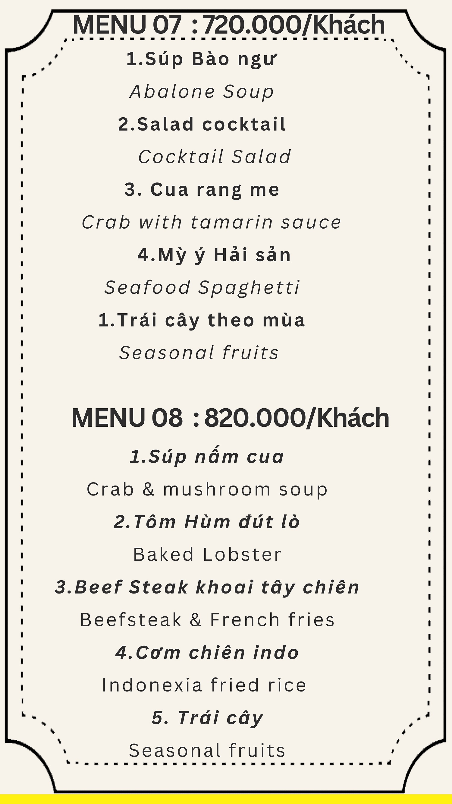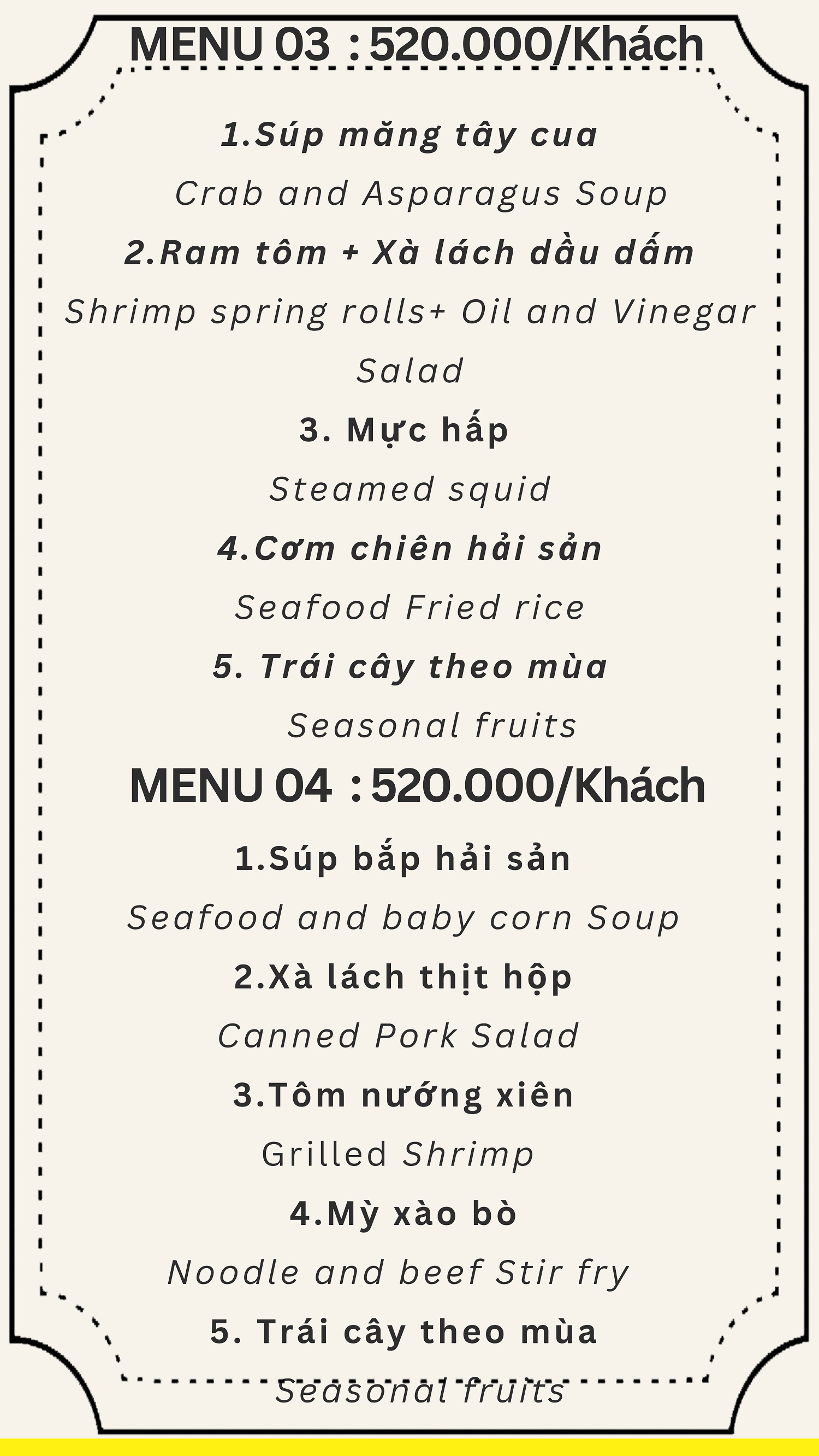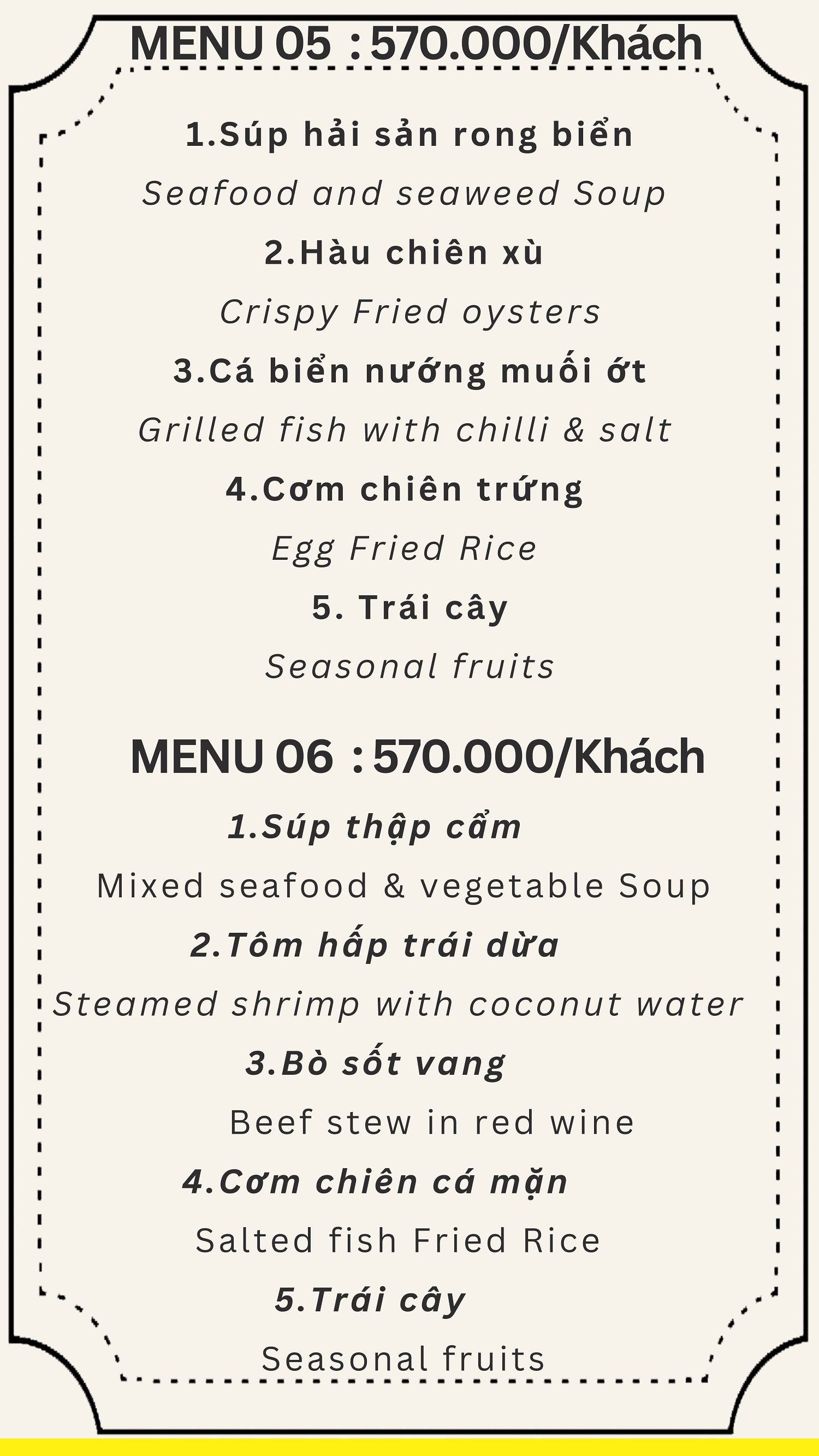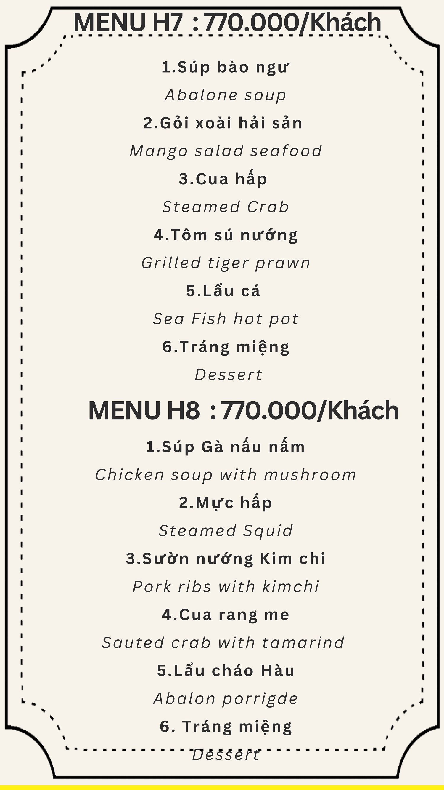 Đội ngũ quản lý, nhân viên phục vụ, đầu bếp được đào tạo nghiệp vụ du lịch chính quy, chuyên nghiệp đối với phục vụ khách du lịch Á, Âu. Thực đơn nhà hàng phong phú với 250 món bao gồm các thực đơn dành cho khách Việt Nam, Hàn Quốc, Nhật Bản, Trung Quốc và khách Âu. Đặc biệt, quý khách có thể thưởng thức các món đặc sản miền Trung, đặc sản Đà Nẵng với hương vị đậm đà.