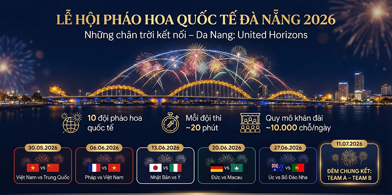 Lễ Hội Pháo Hoa Quốc Tế Đà Nẵng 2026 (DIFF 2026) tiếp tục khẳng định vị thế là sự kiện văn hóa - du lịch tầm cỡ quốc tế, mang đến cho thành phố biển Đà Nẵng một mùa hè bùng nổ cảm xúc. Không chỉ là những màn pháo hoa ngoạn mục, DIFF 2026 còn là nơi hội tụ của nghệ thuật trình diễn, công nghệ ánh sáng hiện đại, âm nhạc đa sắc màu và những câu chuyện văn hóa độc đáo đến từ nhiều quốc gia trên thế giới. Với quy mô ngày càng mở rộng, lễ hội pháo hoa Đà Nẵng 2026 hứa hẹn tạo nên dấu ấn mạnh mẽ trong lòng người dân, du khách trong nước và quốc tế.